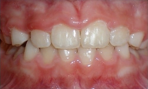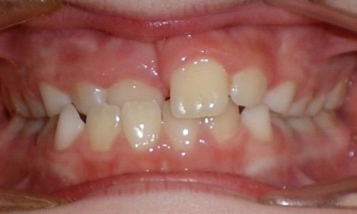 This young patient presented to our office with a crossbite (top front tooth behind bottom front tooth).